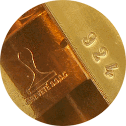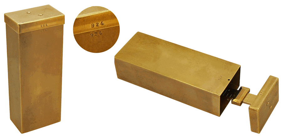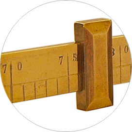 Dans la boîte de 13 x 5 x 3,2 cm est rangée la petite balance romaine. Les deux éléments, entièrement en laiton, se complètent et portent le même numéro. Il s'agit, concernant notre spécimen, du n° 924. |