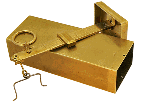 Le poids en forme de curseur est déplacé jusqu'à obtention de l'horizontalité du bras de la balance gradué de 65 à 82. L'équilibre est effectif pour une position du bord gauche du curseur sur la division 76 de l'échelle graduée. |