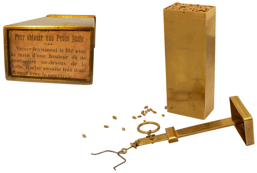 La lecture est directe : la masse volumique du blé est égale à 0,76 g/cm3 ou, puisque le résultat en matière de céréale est généralement donné en kilogramme par hectolitre, 76 kg/hL. |