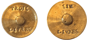 Nous avons vérifié la valeur des différentes tares afin de confirmer l'espèce liée à chacune d'elles. Les pesées étant réalisées avec une précision de 5 mg, les résultats obtenus, inscrits sous l'image de chaque tare, sont conformes aux valeurs "officielles" excepté dans le cas du demi écu de 3 livres et de l'écu de 6 livres en argent qui apparaissent plus faibles