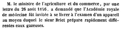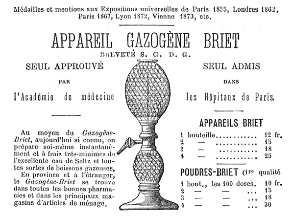 Cet "appareil de ménage" dont l'invention par BRIET, mécanicien devenu horloger, remonte à 1840 n'était pas seulement utilisé dans la fabrication de l'eau de Seltz. Des recettes étaient proposées pour élaborer des eaux minérales gazeuses comme l'eau de Vichy, des sodas, des limonades et même du vin mousseux ... La publicité de l'époque précise qu'il était admis dans les hopitaux et hospices de Paris et approuvé par l'académie de médecine. Il suffit de cliquer sur le texte encadré qui suit pour accéder au rapport complet : |