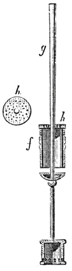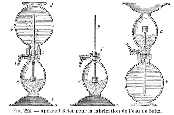 "Il se compose de deux vases en verre a, b (fig. 252) ; dans le vase inférieur a, on place un mélange d'acide tartrique et de bicarbonate de sodium sec (18 gr. d'acide tartrique et 21 gr. de bicarbonate de sodium pour saturer un litre d'eau). On ferme ce vase avec un cylindre creux f en étain, traversé par un tube gg de même métal, terminé inférieurement par une espèce de pomme d'arrosoir. On renverse ensuite le vase a ainsi fermé et on le visse sur le vase b, rempli d'eau ; enfin, on retourne l'appareil de façon à le faire reposer sur sa base. Aussitôt, la partie supérieure du liquide de b descend par le tube dans le vase a, et détermine la réaction de l'acide tartrique sur le bicarbonate de sodium. Il se produit une vive effervescence : le gaz carbonique traverse de très petits trous percés dans le disque h, qui termine le cylindre creux f, et vient se dissoudre dans l'eau du vase b ; on facilite la dissolution en agitant l'appareil. Pour verser l'eau de Seltz, il suffit de tourner le robinet à vis du tube latéral i." |
