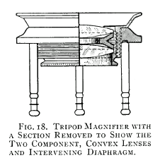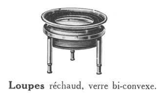 En 1882, dans la 3e édition de L'ETUDIANT MICROGRAPHE, c'est sous le nom de "loupe à réchaud" qu'Arthur Chevalier évoque la loupe tripode. On trouve une appellation voisine "loupe réchaud" chez des constructeurs de matériel de laboratoire comme G. Fontaine , Exupère, N. Boubée & Cie ... |