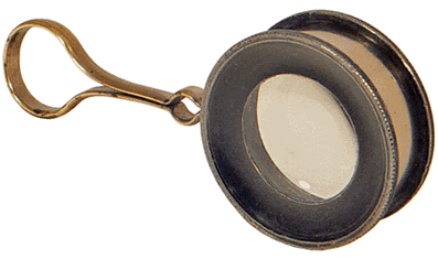 La monture renferme deux lentilles biconvexes fines, maintenues écartées l'une de l'autre par une bague en bois qui joue également le rôle de diaphragme en arrêtant les rayons qui s'écartent trop de l'axe principal. La disposition, qui consiste à utiliser deux lentilles de courbures moindres plutôt qu'une seule lentille plus épaisse, donc plus convergente, réduit les aberrations et permet obtenir, pour un même grossissement, des images moins irisées sur les bords. Le diamètre du modèle présenté est égal à 4,5 cm. |