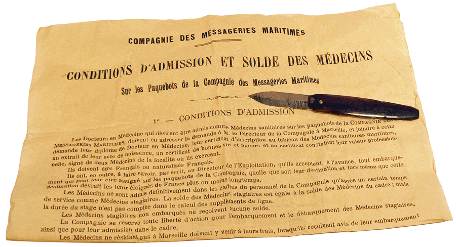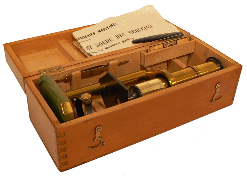 Curieusement, le coffret renferme une notice du 4 août 1910 de la Compagnie des Messageries Maritimes destinée aux candidats médecins ainsi qu'une petite lancette pliante à manche en écaille signée Chartier. Il semble peu probable qu'un tel microscope ait été utilisé par un praticien si ce n'est, et pourquoi pas, afin de mettre en évidence les parasites, poux, puces et autres sarcoptes ..., qui ne devaient pas manquer à bord. Ces petits animaux ne nécessitent pas de forts grossissements pour nous montrer les détails de leur anatomie. Mais, ce n'est qu'une supposition parmi les multiples explications possibles et plus vraisemblables ...