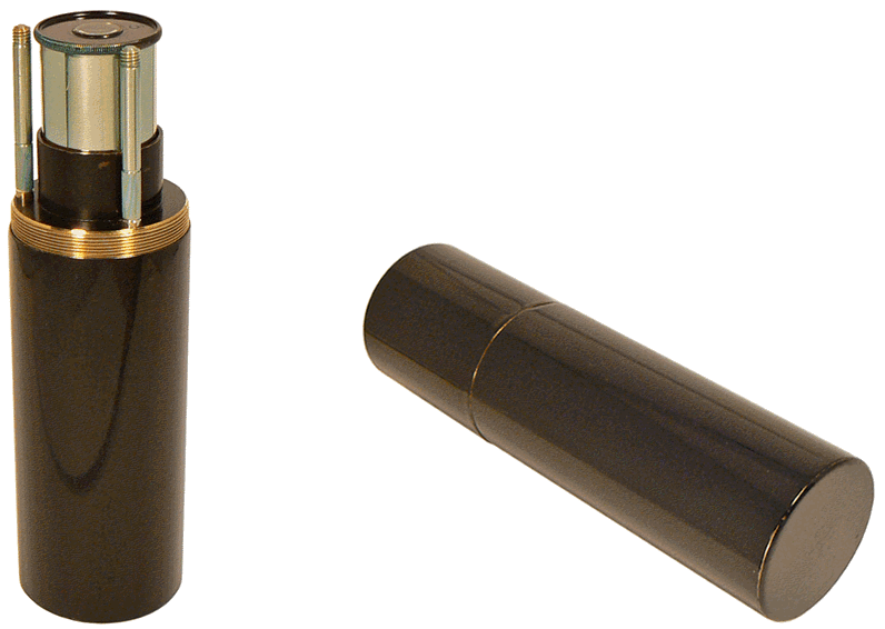 Le microscope est protégé par un solide étui de 14 x 4 cm, en laiton laqué noir. Les deux parties de l'étui se vissent sur une épaisse bague filetée solidaire de l'appareil. La plus petite partie de l'étui porte la marque du fabricant allemand : |