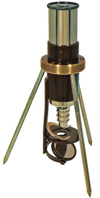 Trois jambes amovibles sont rangées parallèlement au tube optique de manière à minimiser l'espace occupé lors du transport. L'une d'elles est, actuellement, ôtée de son logement. Ces jambes sont destinées à être vissées sur la bague filetée pour former le support tripode de l'appareil. |