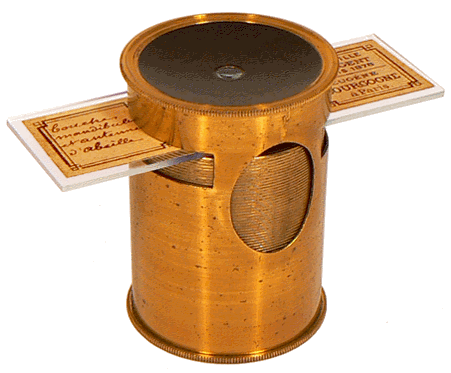 Pour observer une préparation, il faut l'introduire dans le corps du microscope en abaissant une platine cylindrique interne qu'un ressort tend à repousser vers l'œilleton. La mise au point s'effectue ensuite par tirage de cet œilleton qui porte le système de lentilles. On peut regretter que rien ne facilite l'opération de mise en place et de retrait de la lame comme c'est le cas sur d'autres modèles. Les photographies qui suivent montrent deux autres instruments possédant le même dispositif à ressort : ils offrent, pour simplifier la manipulation, soit deux larges ouvertures ménagées sur le corps du microscope, soit deux ergots solidaires de la platine interne. Il est ainsi possible d'abaisser la platine mobile d'une main, d'introduire la préparation de l'autre main puis de relacher doucement la pression sur la platine jusqu'au blocage. |