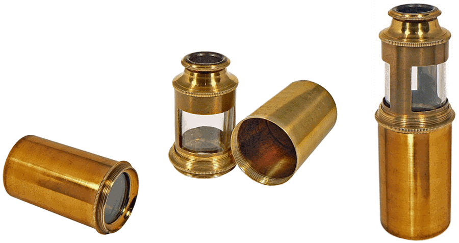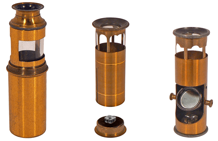 A gauche, l'étui cylindrique de 5 x 2,8 cm contient les éléments nécessaires à la mise en œuvre du microscope. Au centre, la partie optique et la cage en verre sont extraites de l'étui. A droite, le microscope est monté sur ce dernier : il mesure 8,5 cm. |