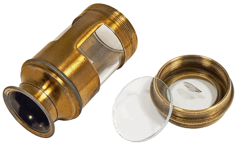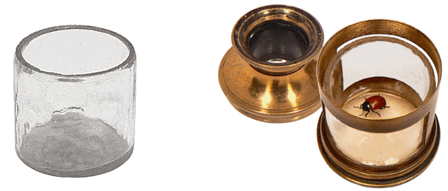 Arthur CHEVALIER fait référence au modèle le plus complet de microscope à graines, modèle pour lequel le dispositif de présentation de l'objet à observer est constitué par un cylindre dont le fond est formé de deux disques en verre transparent en contact l'un de l'autre : c'est ce modèle que nous avons utilisé pour étudier l'aile de mouche. Quelquefois l'instrument est simplifié, l'objet à examiner étant placé dans une simple cuve cylindrique en verre épais et à fond plat : c'est le cas, ci-dessous, pour notre petit coléoptère. Lorsque cette cuve possède un fond dépoli, ce dernier diffuse bien la lumière. En revanche, le système n'est pas approprié pour l'observation d'un objet transparent qu'il est préférable de disposer entre deux verres et que l'on observe en dirigeant le microscope vers une source de lumière, sans le monter sur son étui. |