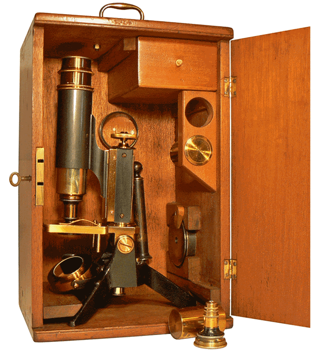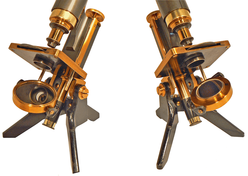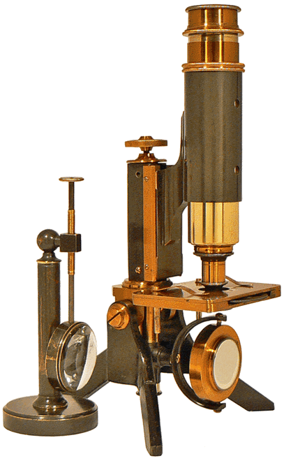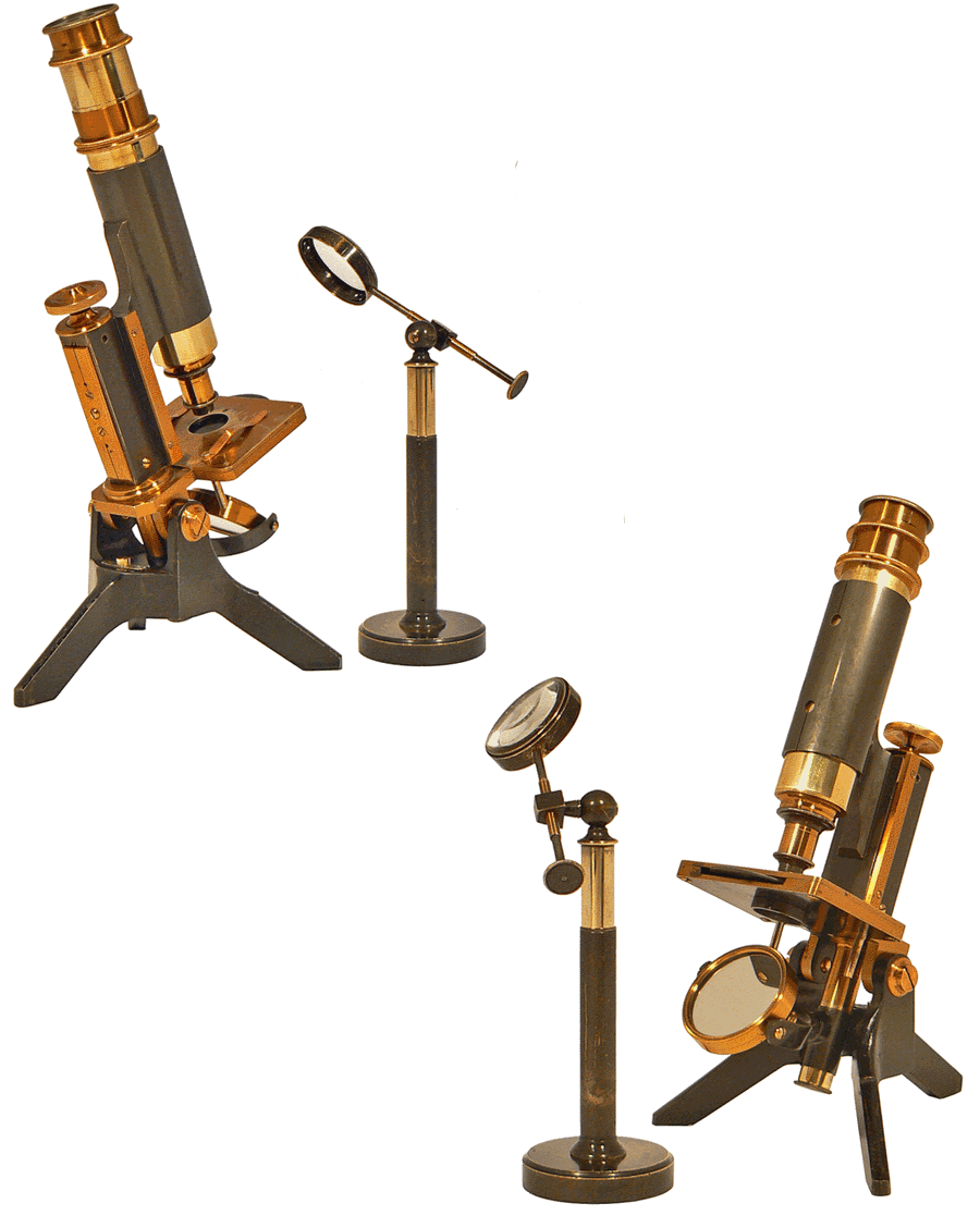 Microscope d'étude et sa loupe sur pied pour l'éclarage des objets opaques - hauteur minimum 26 cm - Royaume Uni - Vers 1890 |