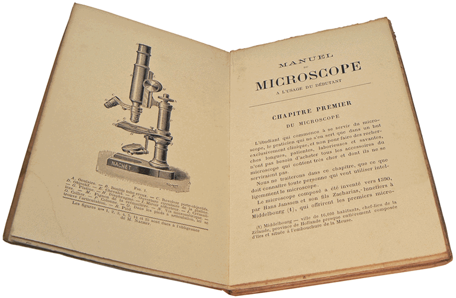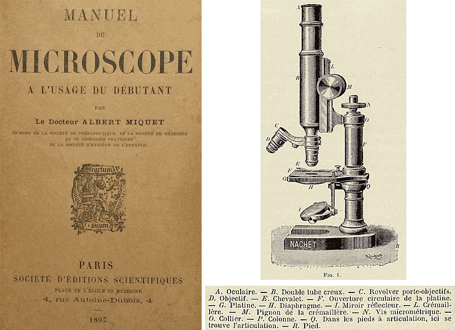 En 1897, dans son MANUEL DU MICROSCOPE à l'usage du débutant, Albert Miquet utilise une image du modèle PCN de Nachet pour nommer, avant de les décrire, les différentes parties d'un microscope. |