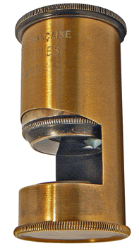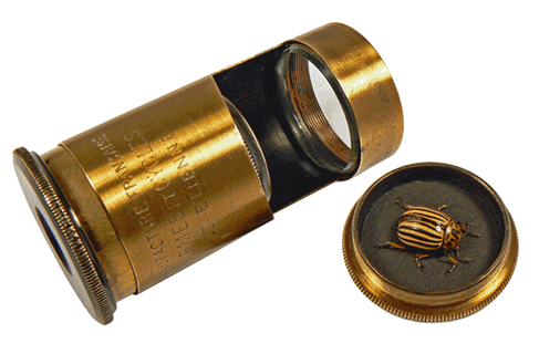 La base de l'instrument est muni d'un bouchon à vis qui libère un espace dont une face est vitrée. Cet espace est utilisé pour y placer, par exemple, un insecte vivant. A l'opposée, l'unique lentille de grande surface offre un large champ de vision et un grossissement de l'ordre de 4 fois. |