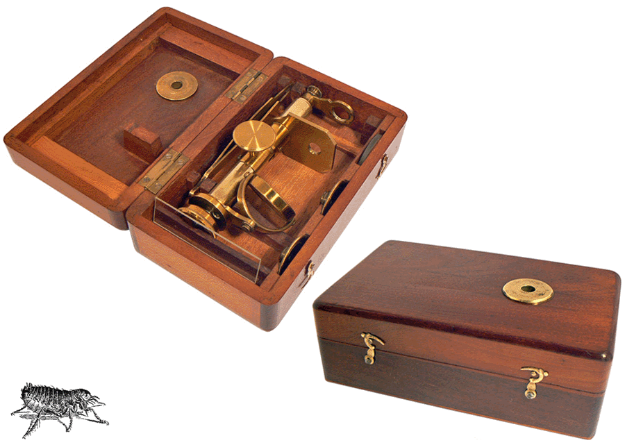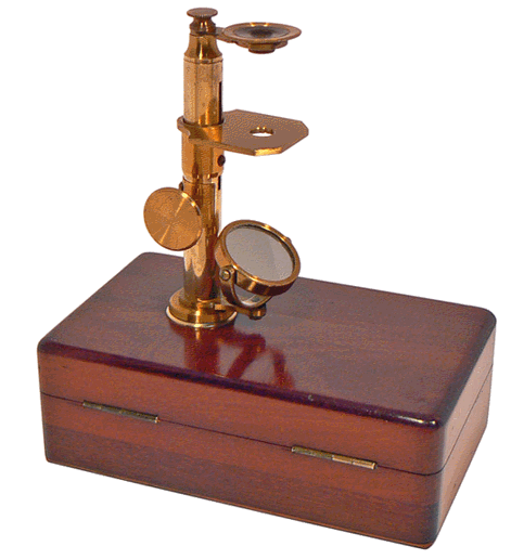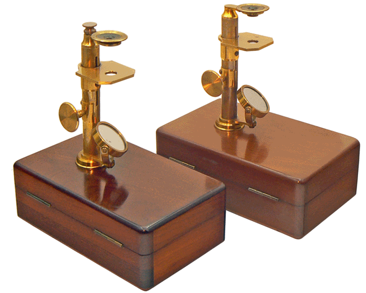 Le Compendium renferme deux de ces microscopes de botaniste. Ils ne sont pas tout-à-fait identiques car dans un cas, le bras qui porte l'œilleton est maintenu en haut de la colonne par une vis à tête moletée alors que dans l'autre cas, ce bras est définitivement assujetti à la colonne... |