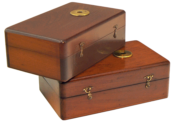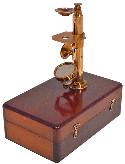 Ce microscope simple était utilisé par les botanistes et les entomologistes. Le coffret mesure 13,7 x 8,3 x 4,6 cm. Une fois la colonne fixée sur le couvercle, la hauteur totale est égale à 15,2 cm. L'instrument, d'origine française, date du milieux du XIXe siècle. |