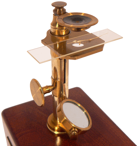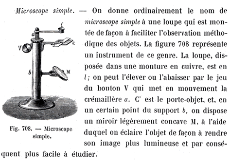 Dans son TRAITÉ ÉLÉMENTAIRE DE PHYSIQUE l'auteur, A. Privat-Deschanel décrit en 1869 un microscope simple dans lequel c'est la lentille que l'on peut abaisser ou élever et non la platine porte-objet comme pour notre instrument. On rencontre l'un ou l'autre système... |