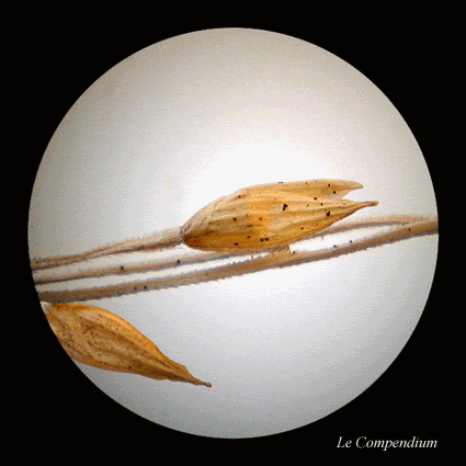 L'œilleton portant la lentille est fixe et la mise au point s'effectue en déplaçant verticalement la platine porte-objet par le jeu d'une crémaillère incluse dans la colonne du microscope. Le mouvement est commandé par un bouton moleté solidaire d'un pignon agissant sur la crémaillère. A droite, la photographie prise à travers l'optique du microscope est celle d'une "herbe folle" qui se trouve actuellement sur la lame porte-objet placée sur la platine. |