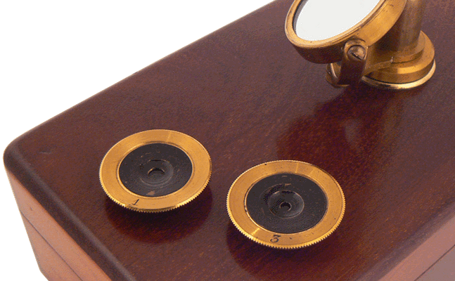 Le coffret renferme deux lentilles numérotées 1 et 3, 3 correspondant au plus fort grossissement. Chaque lentille est maintenue dans un œilleton qui se visse sur le bras horizontal du microscope. |