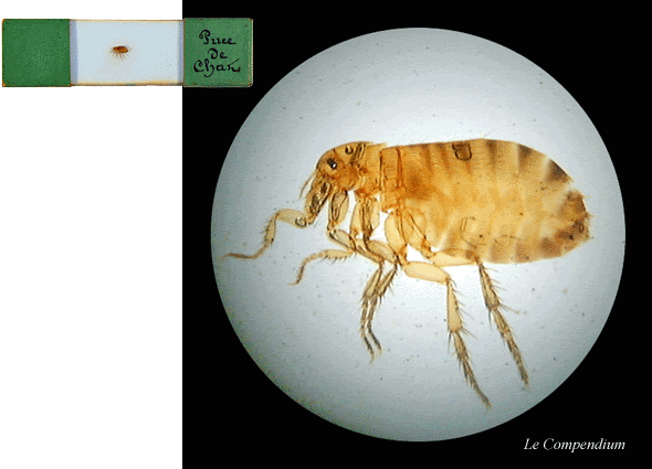 Cette autre photographie est celle d'une lame montée du XIXe siècle. Elle présente une puce de chat. Nous avons choisi le plus faible grossissement pour obtenir une vue d'ensemble : le champ de vision est, ici, de l'ordre de 5 mm. |