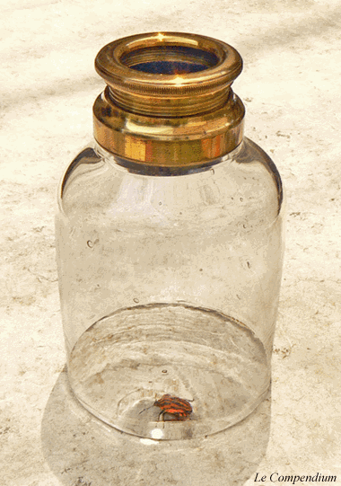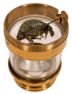 Le fond vitré remis en place, il suffit de tourner le petit bouton extérieur pour observer l'insecte de tous côtés. L'optique consiste en un doublet formé par deux lentilles plan-convexes de 3 cm de diamètre fixées dans une monture à vis permettant la mise au point. |