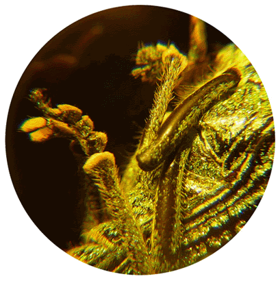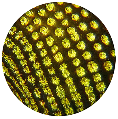 Le charançon Entimus imperialis, qui peut atteindre 3 cm, vit dans la forêt amazonienne. Ses élytres présentent des petites dépressions formant des lignes parallèles régulières. Dans chacune de ces dépressions, des petites écailles forment des zones étincelantes. Pour cette raison, le coléoptère est appelé diamond beetle ou scarabée diamant. L'image de gauche montre une partie d'élytre, vue à travers les lentilles de notre insectoscope ; à droite, ce sont les pattes, quelque peu recroquevillées. |