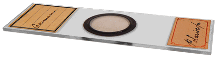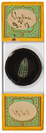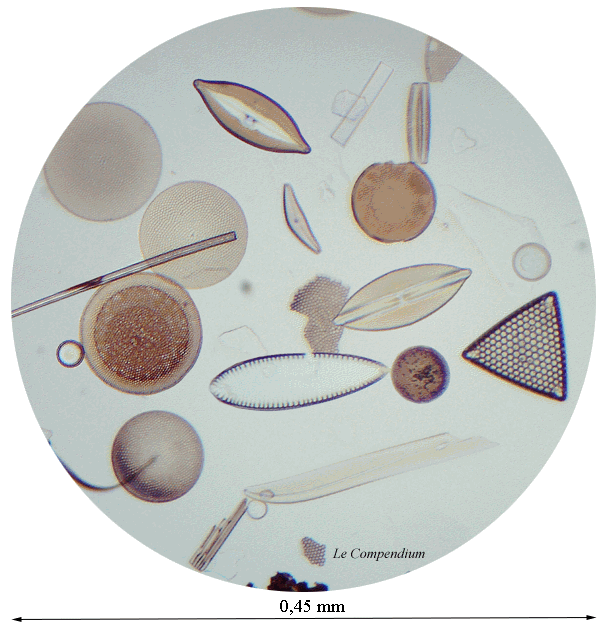 Les dimensions réelles du rectangle de sélection (ci-dessus) sont égales à 0,60 x 0,45 mm. Sur la lame (à gauche), la partie qui est couverte de diatomées est protégée par une lamelle couvre-objet collée sur la cellule circulaire en vernis noir dont le diamètre intérieur est de 10 mm. La zone photographiée ne représente donc qu'une petite partie de la préparation. |