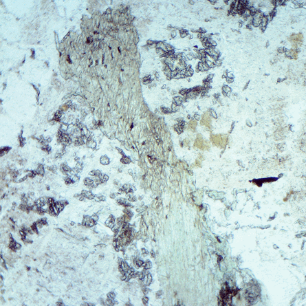 Une lame mince de diorite observée, ci-dessus à gauche, en lumière naturelle et, à droite, en lumière polarisée. Les contrastes et couleurs qui apparaissent en lumière polarisée renseignent le micrographe sur la présence de composants optiquement actifs. Une page du Compendium est consacrée aux lames minces d'Ivan Werlein examinées au microscope polarisant. On y accède directement en cliquant sur le lien au bas de cette page. |