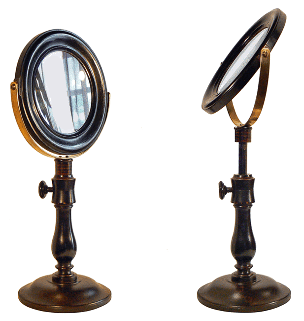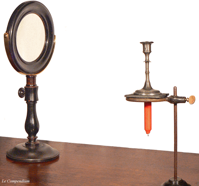 Ce miroir était utilisé pour les expériences réalisées pendant le cours d'optique. On le retrouve dans la plupart des traités de physique de la fin du XIXe et du début du XXe siècle. Il sert à étudier expérimentalement la formation de l'image d'un objet, telle une bougie, que l'on place à une certaine distance de la surface réfléchissante. On détermine alors la nature de cette image, son sens ainsi que sa taille. |