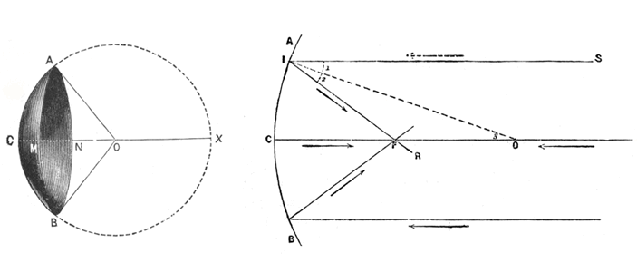 Les deux figures, empruntées au Traité de Physique de E. Drincourt (édition de 1902), permettent de définir le miroir concave limité par la calotte sphérique ACB polie intérieurement. C est le sommet du miroir, O est son centre de courbure. Le foyer principal F, par lequel passent tous les rayons incidents parallèles à l'axe principal CO, est à égale distance de C et de O. |
