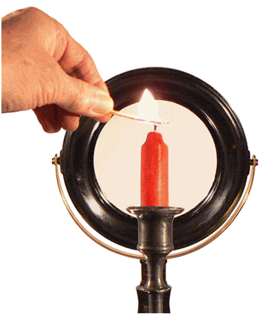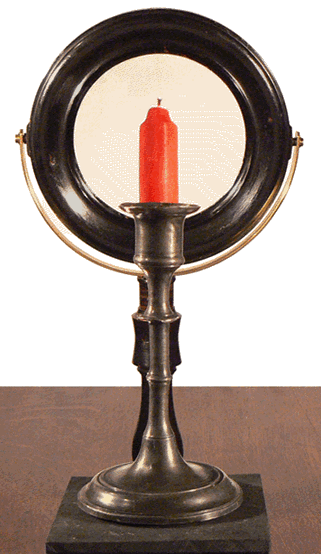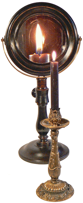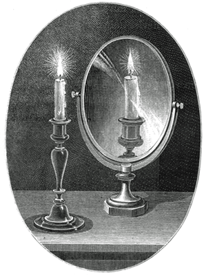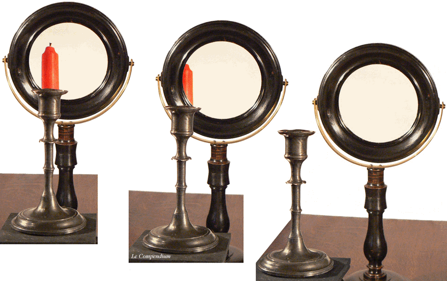 Les trois images représentent trois stades du déplacement évoqué. Nous avons, pour une meilleure visibilité, décalé vers le bas chaque image par rapport à la précédente. Au début, le chandelier et sa bougie, placés entre le miroir et l'œil de l'observateur semble glisser vers la gauche. Sur l'image du milieu, le déplacement se poursuit mais on observe qu'une partie de la bougie disparaît. A droite, la bougie a complètement disparu. Elle existe pourtant bien, mais pas à l'endroit où elle semblait être. C'est son image, impalpable, que nous avons observée jusqu'à maintenant et il est bien normal que n'ayons pu l'allumer... |