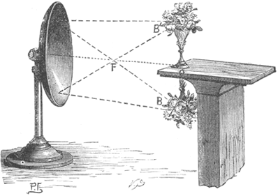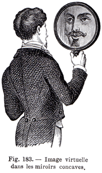 Les dessins du TRAITÉ ÉLÉMENTAIRE DE PHYSIQUE de A. PRIVAT DESCHANEL (1869) et du COURS DE PHYSIQUE de A. GANOT (1863), ainsi que la photographie à droite, montrent l'image virtuelle obtenue lorsque l'objet est placé entre le foyer et le miroir. Cette image est droite et plus grande que l'objet. Cela explique l'usage qu'on fait des miroirs concaves comme miroirs grossissants. |