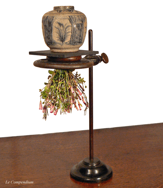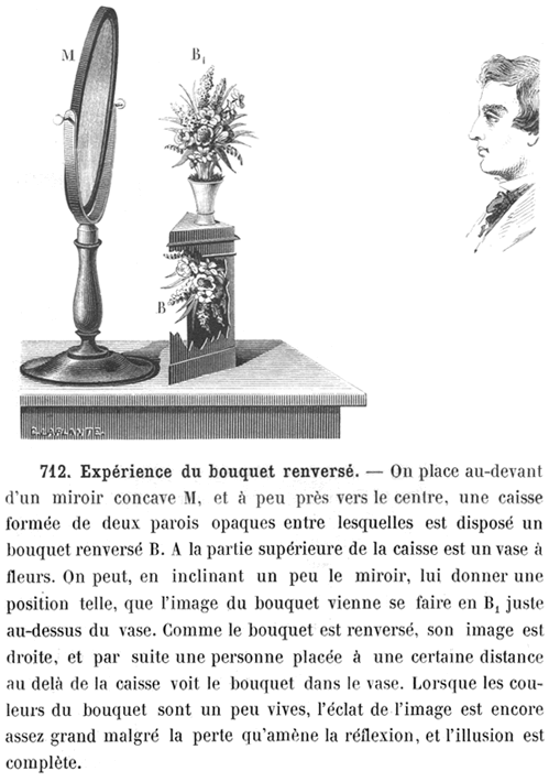 En réalité, la bougie est fixée à l'envers dans un plan vertical passant par le centre de courbure du miroir. Dans ces conditions, l'image donnée par le miroir est réelle, inversée et de même grandeur que l'objet. En plaçant le chandelier juste au dessus de la bougie et en inclinant convenablement le miroir, on amène l'image de la bougie à se "poser" en haut du chandelier. Si on dispose un écran blanc derrière la bougie pour supprimer toute image parasite, l'illusion est parfaite. Nous avons, pour une meilleure vision du montage, retiré cet écran - une simple feuille de papier - qui se trouvait entre la bougie et la tige verticale du statif. Une expérience de cours, en tout point similaire mais utilisant un vase et un bouquet de fleurs, est décrite dans quelques anciens traités de physique : |