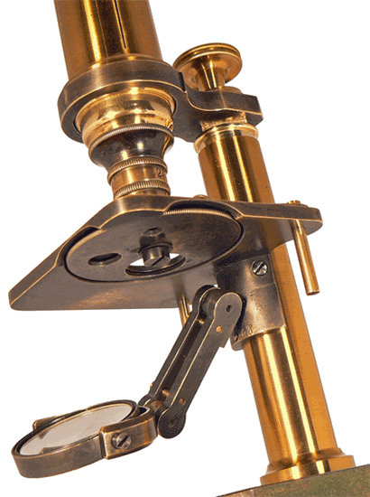 L'éclairage est assuré par un miroir à double face, plane et concave articulé sur un bras à rotules. Un diaphragme tournant permet de moduler la lumière. Le réglage primaire est réalisé par le coulant et la mise au point fine par vis micrométrique |