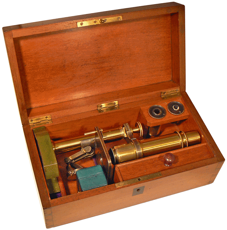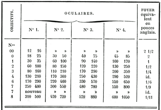 L'écrin renferme deux objectifs n° 2 et n° 6. Combinés aux oculaires 1 et 4, présents dans le coffret du microscope, il est possible d'obtenir des grossissements qui varient entre 60 et 650 fois. Sur le tableau, tiré du Traité de E.Trutat et donnant les "renseignements nécessaires sur la puissance des objectifs de monsieur Vérick", les faibles grossissements (à gauche dans chaque colonne) s'obtiennent à l'aide du corps du microscope raccourci, et le chiffre plus élevé (à droite dans une même colonne) avec le corps complètement tiré. |