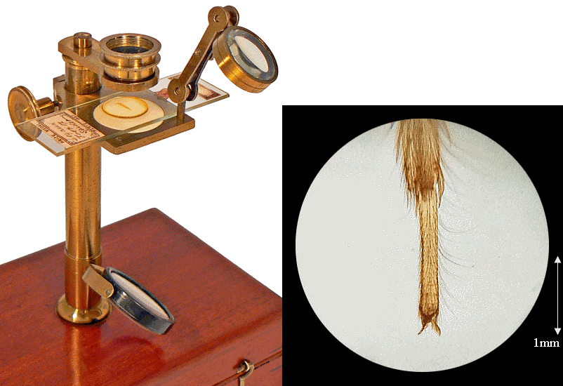 Lors de l'utilisation en microscope simple, un jeu de trois lentilles permet de moduler le grossissement. Nous avons testé la configuration avec une patte d'araignée, "Leg and Foot of Spider", préparée par Cole vers la fin du XIXe siècle. Nous observons la partie terminale, c'est-à-dire une zone d'environ 3 mm de longueur. La lame est posée sur le disque en ivoire. La photographie est réalisée à travers un groupement de deux des trois lentilles accompagnant l'instrument. |