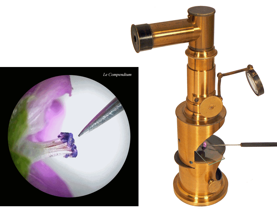 Nous utilisons ici le "microscope achromatique simplifié" construit par LEREBOURS vers 1850, dans sa version horizontale, c'est-à-dire muni d'un renvoi à angle droit par prisme à reflexion totale. Notre oculaire à prisme redresseur a remplacé l'oculaire classique. Les deux prismes, celui du renvoi coudé et celui de l'oculaire sont croisés c'est-à-dire que leurs arêtes sont horizontales pour le premier et verticales pour le second. A travers l'instrument ainsi équipé, les déplacements de l'extrémité de "l'aiguille montée", qui est sur le point de toucher le groupe d'étamines d'une fleur, sont suivis comme à l'œil nu. Sur la photographie du microscope, la pointe métallique est - pour un observateur placé correctement - en haut et à droite de la platine c'est-à-dire dans le premier quadrant. Il en est de même de l'image vue à travers le microscope.