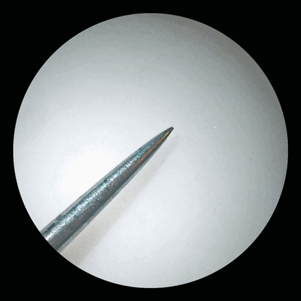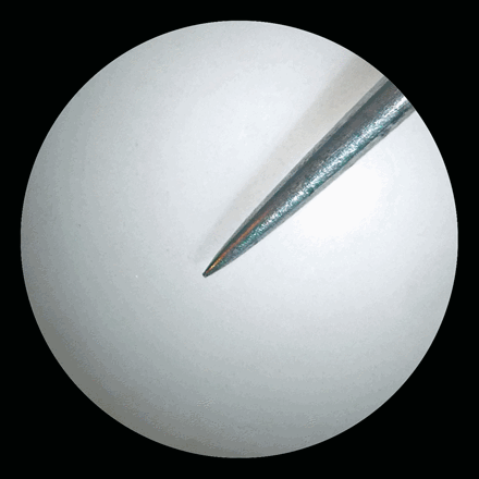 L'aiguille montée du manipulateur étant maintenue comme précédemment, la microphotographie ci-dessous à gauche et son image symétrique par rapport à l'axe optique du microscope, à droite, illustrent le champ de vision obtenu, d'une part, avec le microscope dans la configuration précédente et d'autre part avec le même instrument utilisé sans le renvoi coudé et sans l'oculaire redresseur c'est-à-dire dans la configuration de microscope ordinaire vertical.