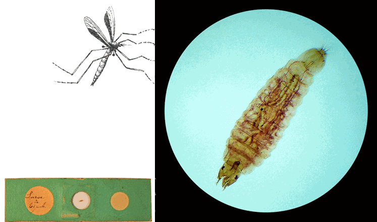Nous avons orienté l'image de la larve de Tipule, photographiée à travers notre microscope, comme sur le dessin de l'insecte parfait sorti de l'ouvrage de C. Houlbert, Les Insectes - Anatomie et physiologie générales (1910). Aussi, les deux points noirs que l'on distingue en bas et à gauche de la larve ne sont pas les yeux mais les orifices respiratoires du diptère ... La longueur de la larve est égale à 1,5 mm. |