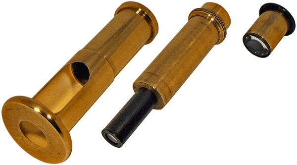 Le corps du microscope est muni d'une semelle plane parfaitement dressée, présentant une ouverture pour visualiser la zone de mesure. Une fenêtre latérale permet l'éclairement de cette zone, la lumière étant diffusée par la paroi intérieure laquée en blanc. Le tube optique comporte un objectif achromatique - délimité par le tube métallique noir - et un doublet de Ramsden qui joue à la fois son rôle d'oculaire dans le fonctionnement globale du microscope et le rôle de loupe permettant d'observer les graduations d'une échelle micrométrique placée à environ 1 cm, au voisinage de son foyer. |