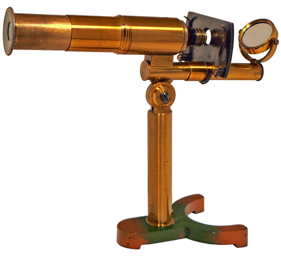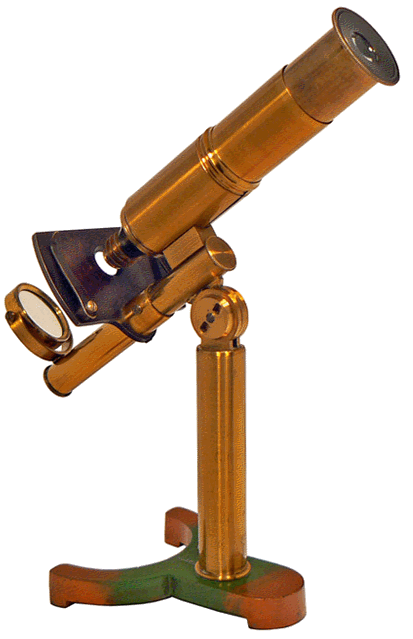 Le microscope ne porte aucun nom de constructeur. Il est semblable à l'un des modèles proposés vers 1880 par McAllister sous le nom "universal microscope" : non seulement la partie optique est identique mais on retrouve le pied caractéristique en forme de Y. La hauteur minimum de l'appareil est égale à 18 cm et le tube optique offre un tirage permettant de l'amener à 24 cm. Il est doté d'un objectif en trois parties superposables permettant de moduler le grossissement. |