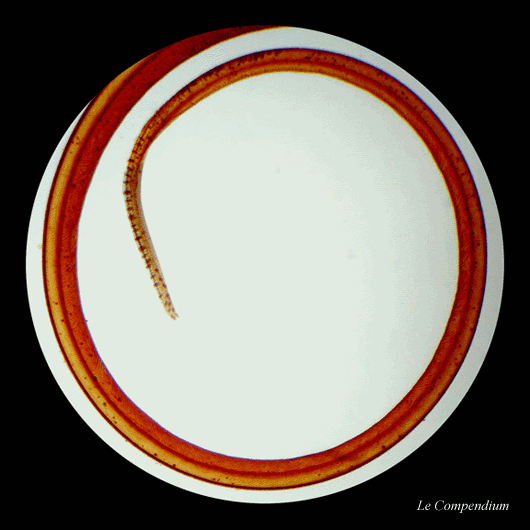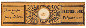 Quatre lames préparées par Charles Bourgogne dans la deuxième moitié du XIXe siècle accompagnent le microscope. Il s'agit des grands classiques : la puce humaine, la plume de colibri, l'aile de mouche et la trompe de papillon. C'est cette dernière préparation que nous avons photographiée à travers l'instrument avec un faible grossissement pour pouvoir observer la trompe enroulée en spirale sur une plus grande longueur. Déployée, elle sert à aspirer les liquides nourriciers. On remarque, dans sa région terminale, les papilles qui sont des organes sensoriels. |