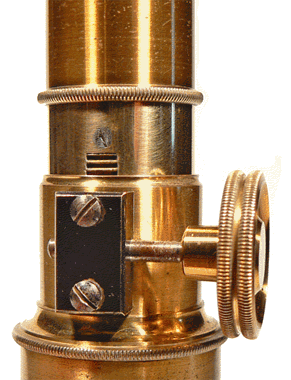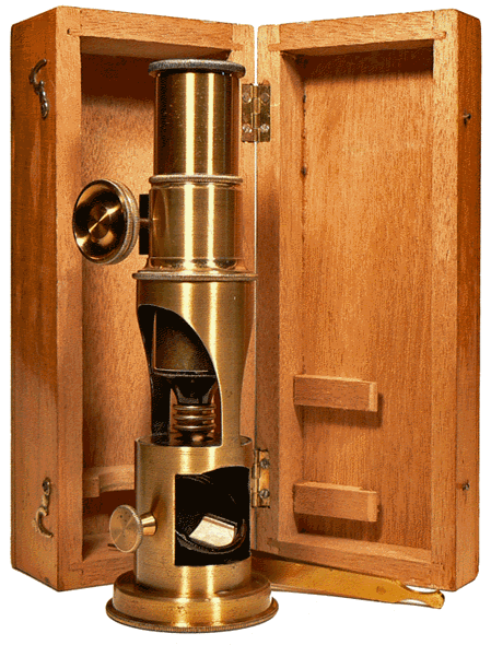 Cet autre instrument, dont la hauteur minimum est également de 15,5 cm, possède une lentille d'éclairement pour l'observation des objets opaques. Il porte le numéro 99. |