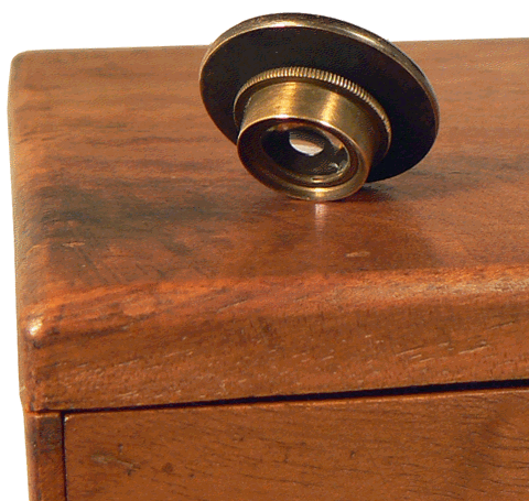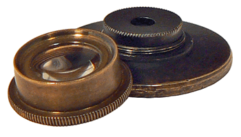 Le microscope utilise des doublets du type Wollaston. Chaque doublet est composé de deux lentilles plan-convexes dont les faces planes sont tournées vers l'objet et séparées par un diaphragme d comme le montrent les coupes empruntées au TRAITÉ DE MICROSCOPIE d'Eugène TRUTAT (1883). |
