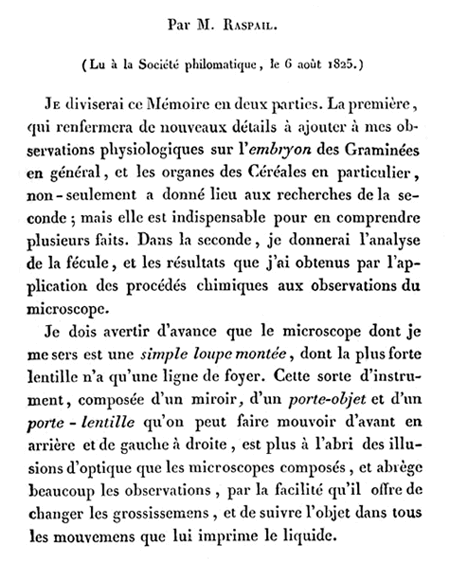 En préambule à la lecture de son mémoire sur le "Développement de la Fécule dans les organes de la fructification des Céréales, et Analyse microscopique de la Fécule, suivie d'Expériences propres à en expliquer la conversion en gommes", François-Vincent RASPAIL donne des précisions sur le microscope qu'il utilise pour ses observations : |