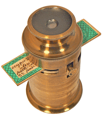 Microscope de poche - Hauteur minimum 6 cm - diamètre du corps cylindrique 3,2 cm - Vers 1870 |