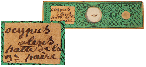 Nous avons photographié, à travers l'optique du microscope, une préparation de patte d'Ocypus Olens, coléoptère noir de la famille des Staphylins, aux élytres très courtes, et que l'on rencontre sous les pierres, sous les écorces et dans les détritus. On le surnomme le diable... La lame, préparée par Joseph Bourgogne micrographe français du milieu du XIXe siècle, accompagnait le microscope à son arrivée dans le Compendium. |