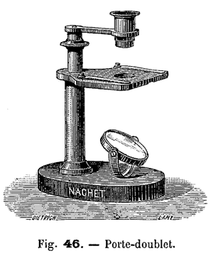 "Porte-doublet à miroir" dans le Catalogue des microscopes construits par A. Nachet de 1886 et "Petit microscope à dissection" dans Les microscopes et accessoires Nachet de 1900 puis de 1910, il est proposé, dans les trois cas, pour 18 francs, "avec un doublet au choix, sans boite". |
