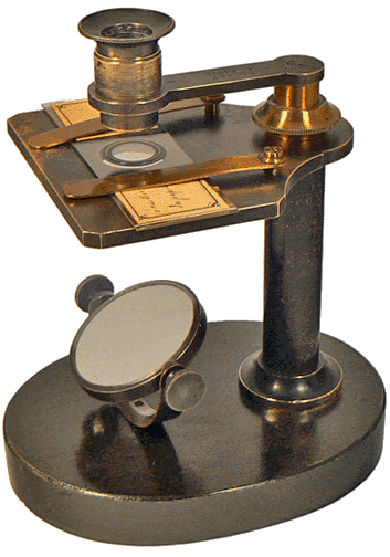 Le modèle a été commercialisé par Nachet pendant plus de 25 ans autour de l'année 1900 et des petites modifications ont été apportées au cours du temps : sur ce deuxième exemplaire, la colonne est en laiton verni. |