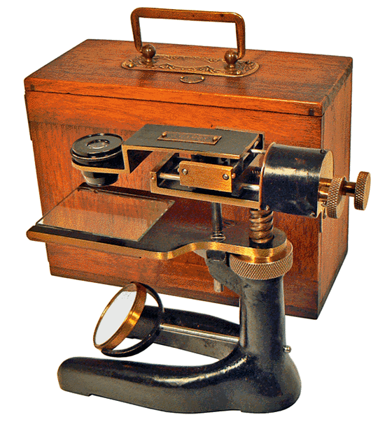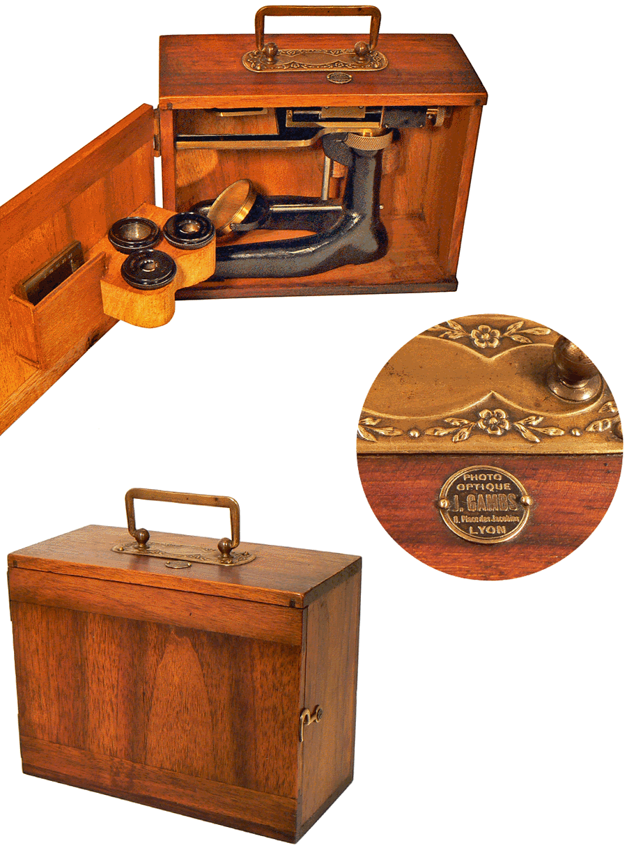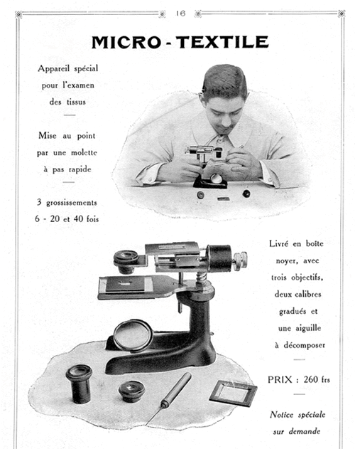 Le microscope, devant son coffret en noyer de 18,5 x 14 x 8,5 cm, est une production de Joseph Gambs, opticien et constructeur lyonnais d'instruments de précision pour les sciences et l'industrie. Il est proposé, sous le nom MICRO-TEXTILE, par la société R. J. Frick implantée dans le Territoire de Belfort et spécialiste des accessoires pour filatures et tissages. |