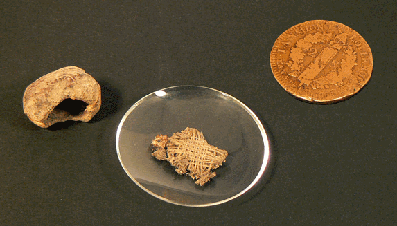 Puisqu'il s'agit d'un microscope destiné à l'étude des textiles, nous avons observé ce qui reste une trouvaille amusante mais également mystérieuse : il s'agit d'un fragment de tissu rangé dans une petite noix percée d'un trou d'une dizaine de millimètres de diamètre. Nous avons découvert l'objet, en même temps qu'une pièce de 2 Sols de 1793, derrière la corniche d'une armoire encastrée dans les pierres d'une ancienne demeure du Périgord. Il faut ajouter que cette corniche, ou la cachette qu'elle masque, se situe à une hauteur de 9 pieds et 3 pouces de France ... pardon, nous voulons dire à environ 3 mètres. On ne va pas tous les jours y déposer, ni rechercher, des objets ... |